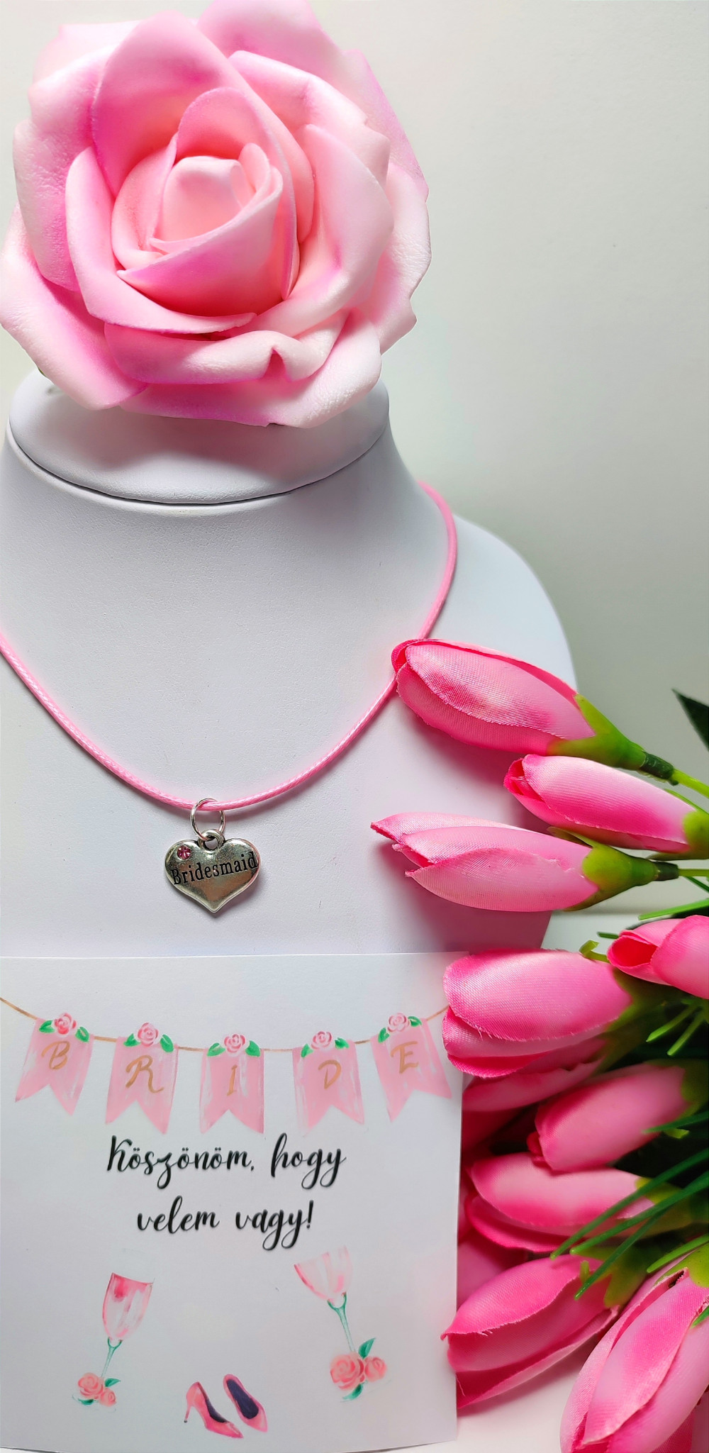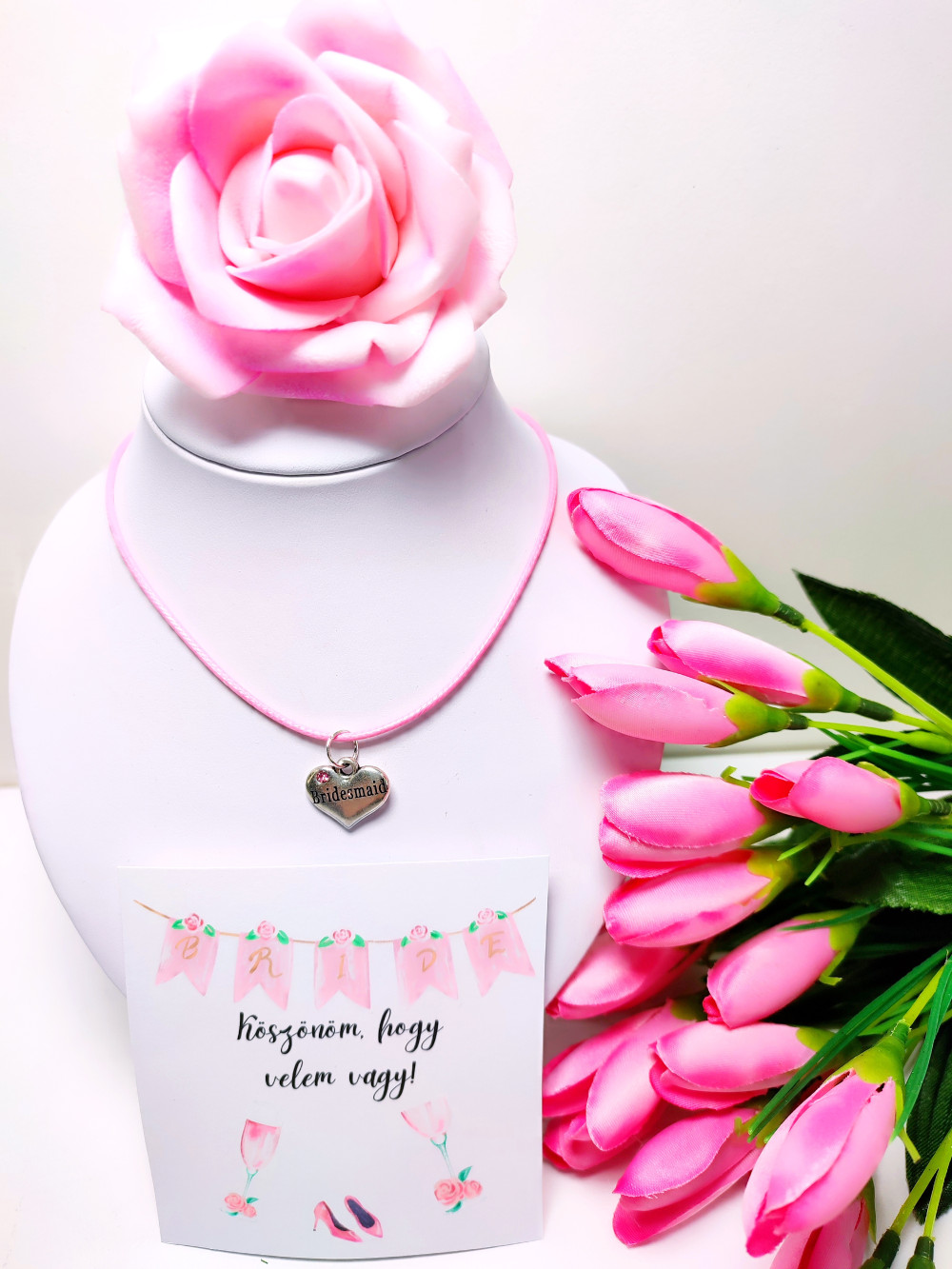 - rózsaszín zsineg nyaklánc szív medállal, BRIDESMAID felirattal