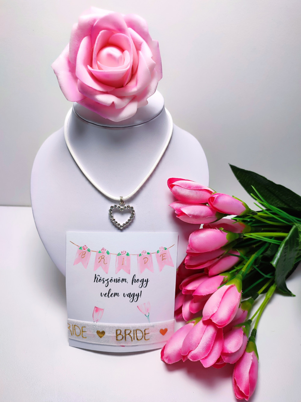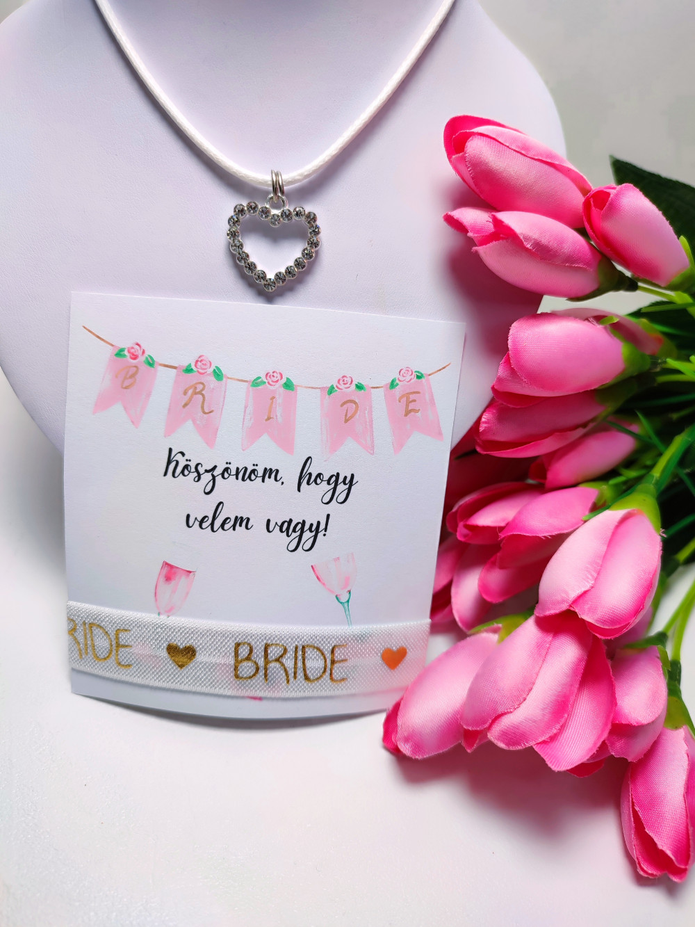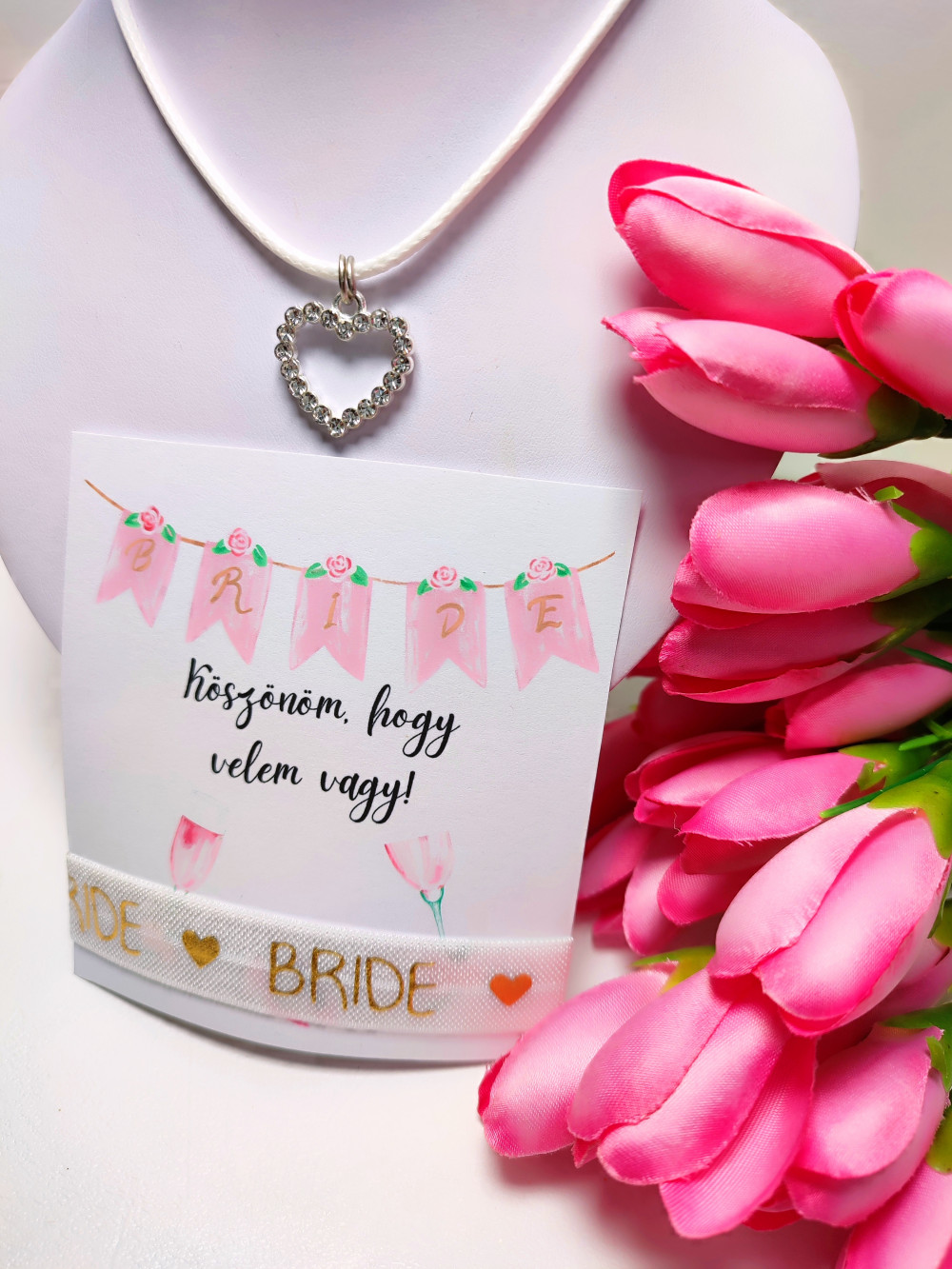Szett tartalma: 1 darab fehér szív medálos lánc, 1 darab BRIDE gumiszalag fehér színben, 1 darab lánybúcsús kísérőkártya "Köszönöm,hogy velem ünnepelsz" szöveggel