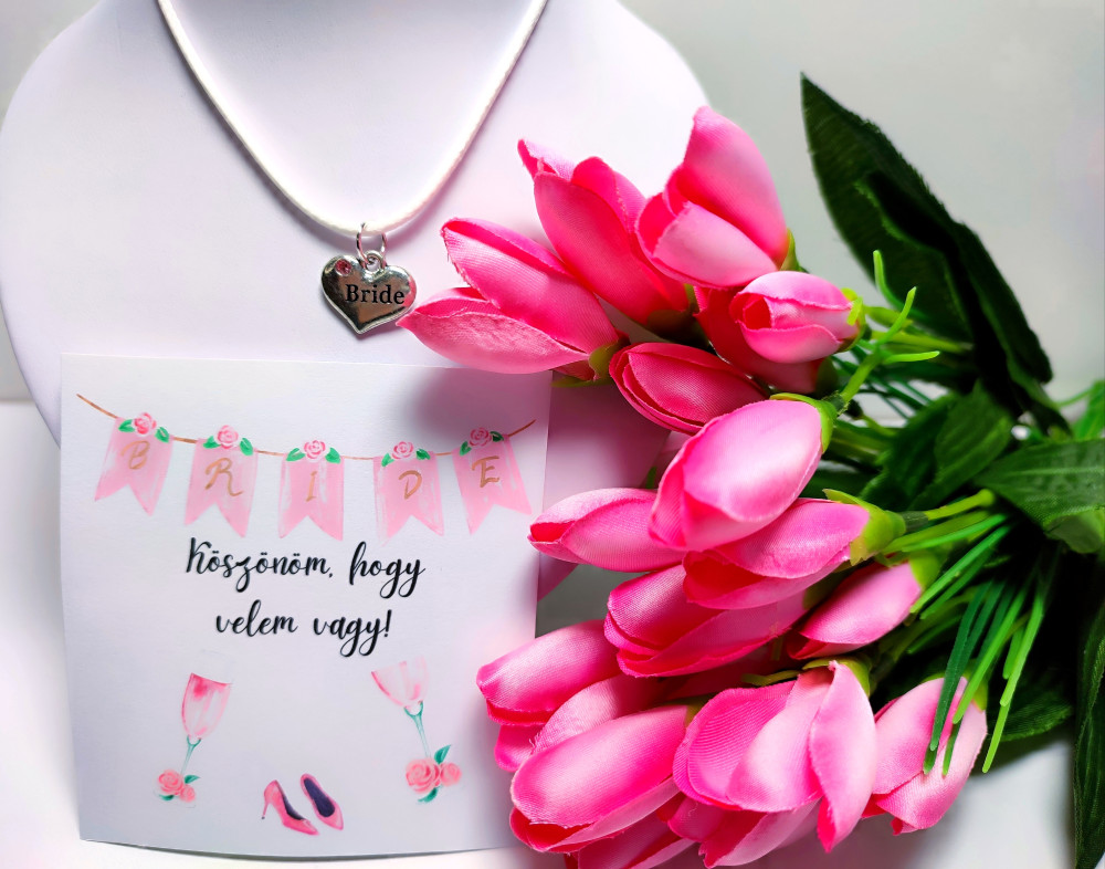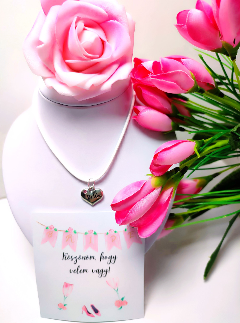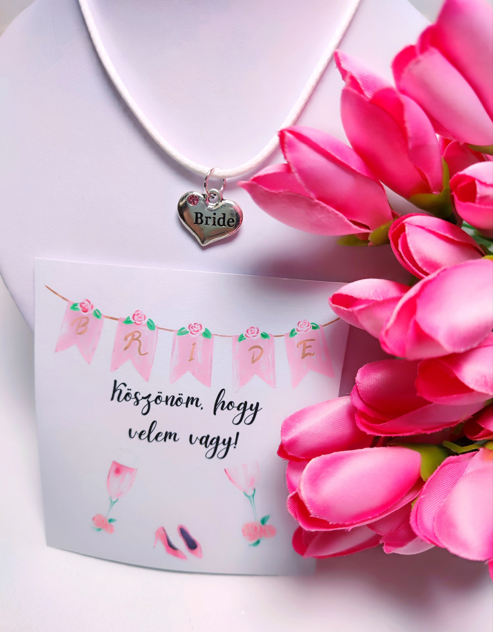 - fehér zsineg nyaklánc szív medállal, BRIDE felirattal